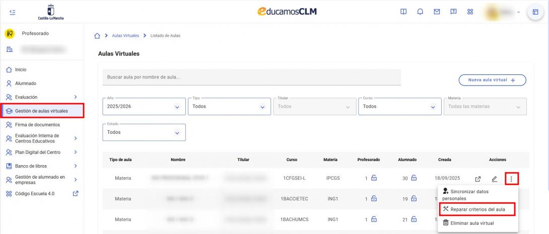 Para acceder a esta función, haz clic en “Gestión de aulas virtuales”, pincha en los tres puntos del aula que quieras reparar y a continuación haz clic en “Reparar criterios del aula”.